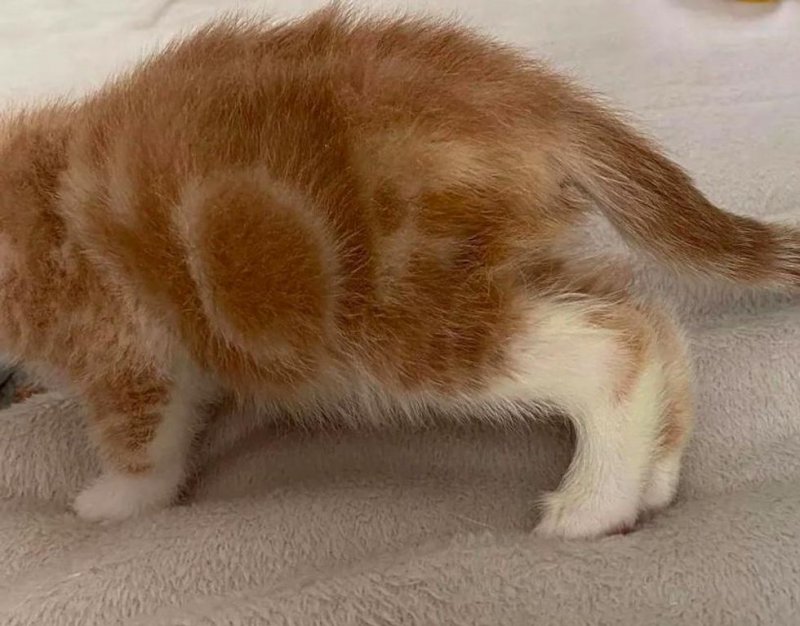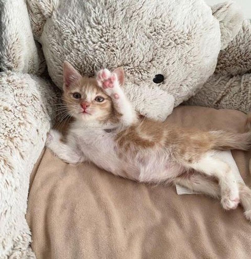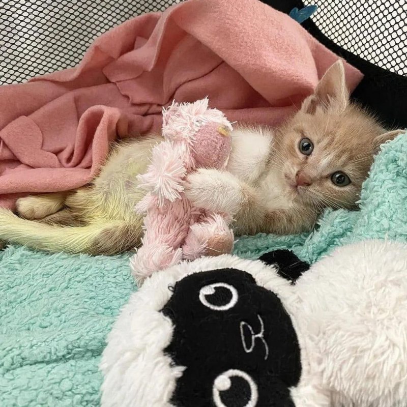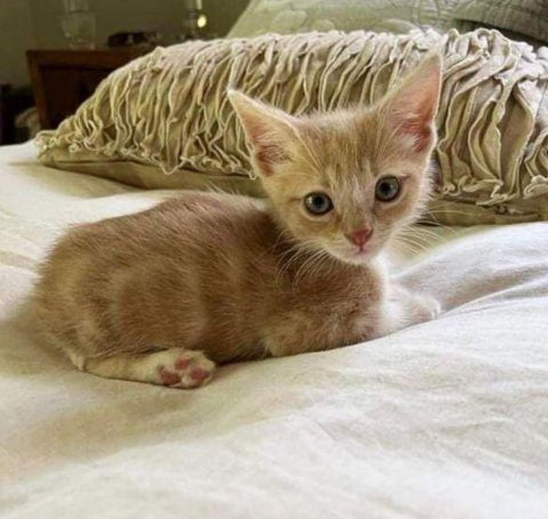 This kitten was picked up on the street in the United States. Its hind legs were paralyzed and it dragged them along, collecting leftovers. They took the baby and took it to Kitten Carer Rescue, where it was happily taken into care.