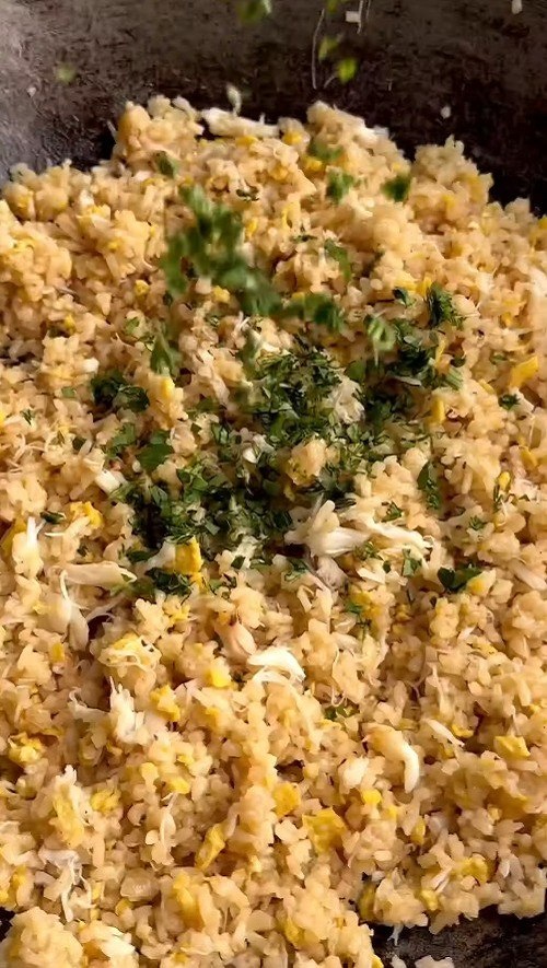 Once the rice, vegetables, and crab meat are thoroughly combined and heated through, reintroduce the scrambled eggs to the pan. Gently toss everything together until the eggs are evenly distributed. Taste the dish and adjust the seasonings if necessary. To add a burst of freshness and color, sprinkle chopped green onions over the crab fried rice before serving.