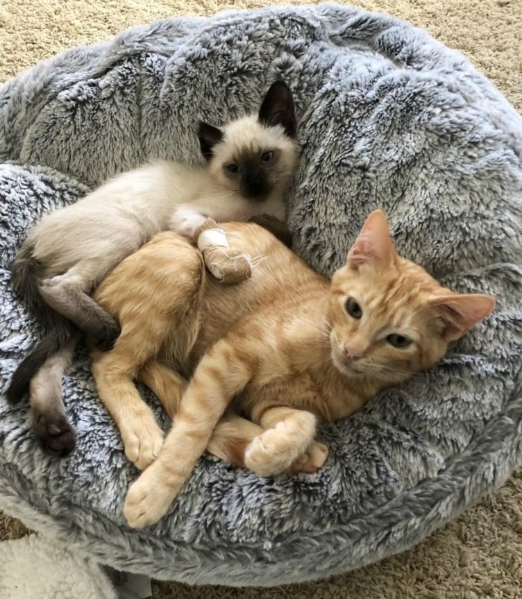 Since then, the friendly couple has become a real gang: they play, cuddle and sleep together. Chester is protective of Beatty. Often when she hears a sudden loud noise or is startled by something, she immediately runs to him. When Chester is picked up by the owner or he is not around, Beatty cries and looks for her protector.