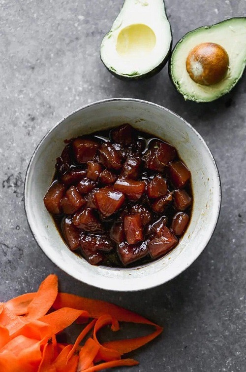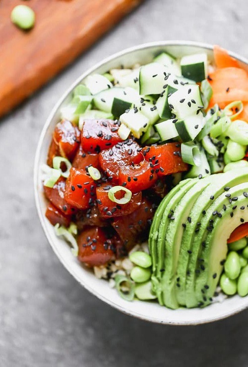 No poke bowl is complete without the luscious addition of avocado. Slice two large avocados and delicately arrange them on top of the vegetable bed. Avocado not only adds a creamy texture but also offers a rich, buttery taste that complements the other ingredients beautifully. Its natural creaminess contrasts with the crunchy vegetables and succulent tuna, enhancing the overall mouthwatering experience.