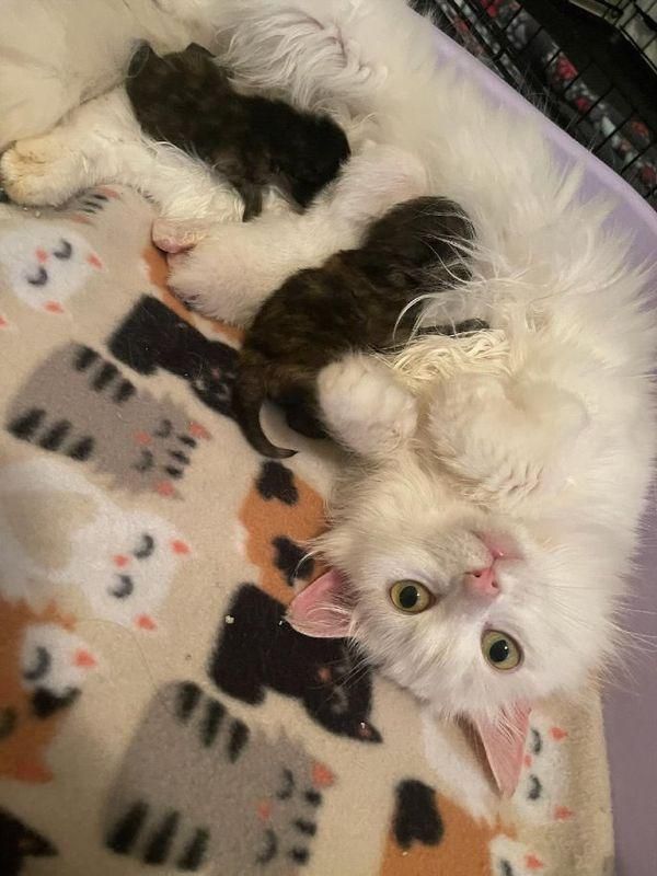 The kitty was named Betty and the male cat was named Yeti, and the couple was then sent to a shelter. There they spent even more time together. After a while, Betty gave birth to four adorable babies.
