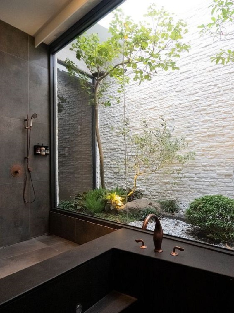 Consider the lighting and natural elements in your bathroom when choosing a color palette: